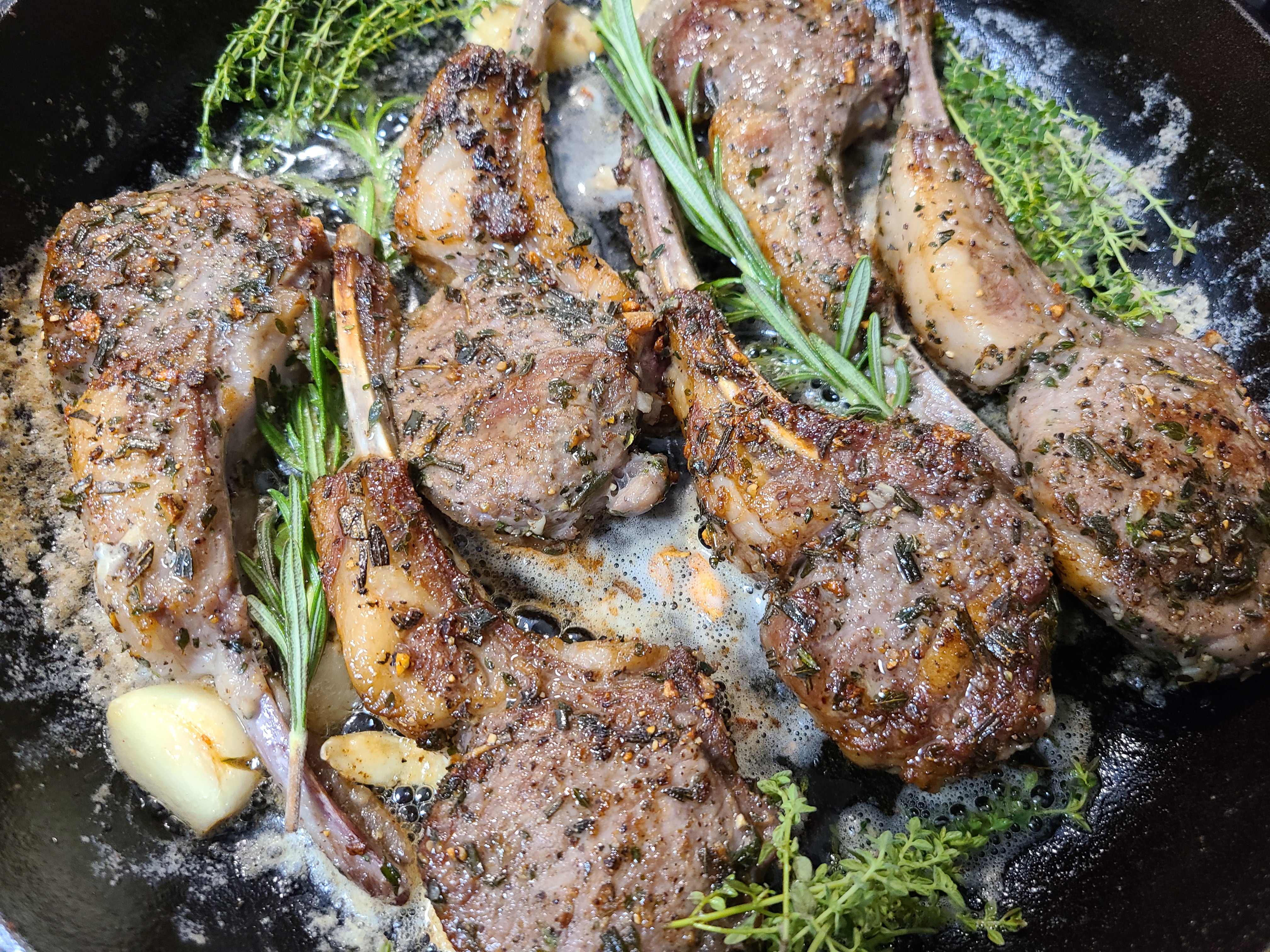 Remove the first half of the chops and drain the oil out, then use paper towels to wipe the cooked herbs and garlic from the pan. Return the pan to the heat, add more oil, then cook the second batch of chops. Drain and clean the oil, herbs, and garlic once more, then add 4 tablespoons of butter and up to 4 smashed cloves of garlic into the pan. Once the butter is melted, position all the chops into the pan and add the whole sprigs of herbs. Tilting the pan, butter baste the chops for up to 2 minutes. Allow the chops 5 minutes to rest before serving.