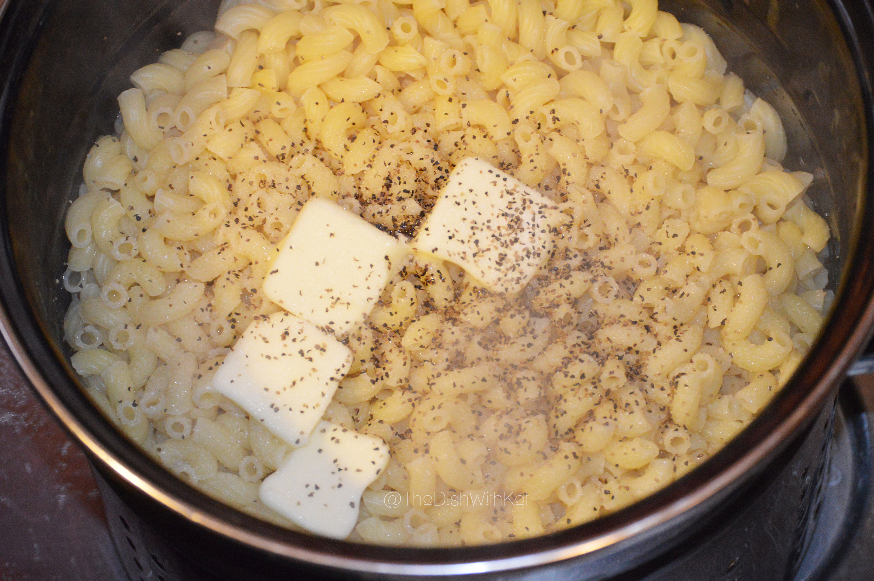 Preheat your oven to 375°. Cook the elbows according to the package’s instructions. Once drained, place the elbows in a large mixing bowl and toss with one tablespoon of the butter and season with salt, pepper, garlic powder, onion powder, and smoked paprika, then set aside.